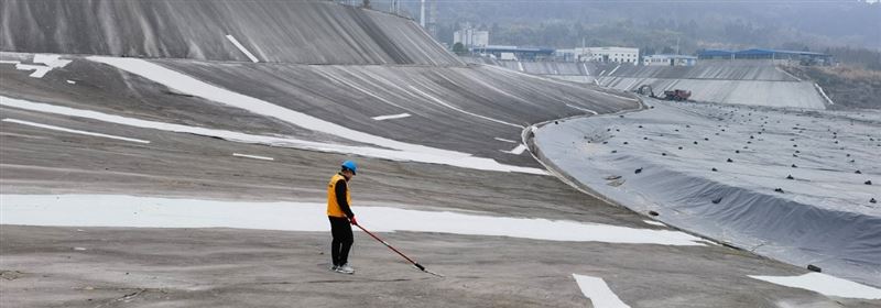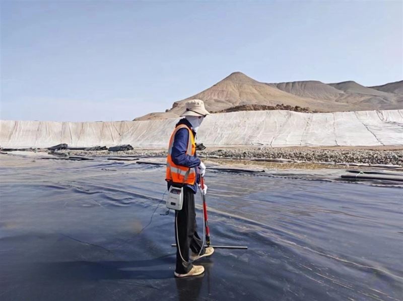 土工膜(HDPE 防渗膜)大规模全面检测电火花法:适用 KODIN-7DJ 土工膜(HDPE 防渗膜)泄漏检测仪,利用蓄电锂电池,脉冲高压原理通过对土工膜(HDPE 防渗膜)表面施加5~50KV 的高脉冲电压,探极在土工膜(HDPE 防渗膜)表面探扫,如无火花或报警声视为漏点合格,出现火花或报警声部位说明有漏洞。